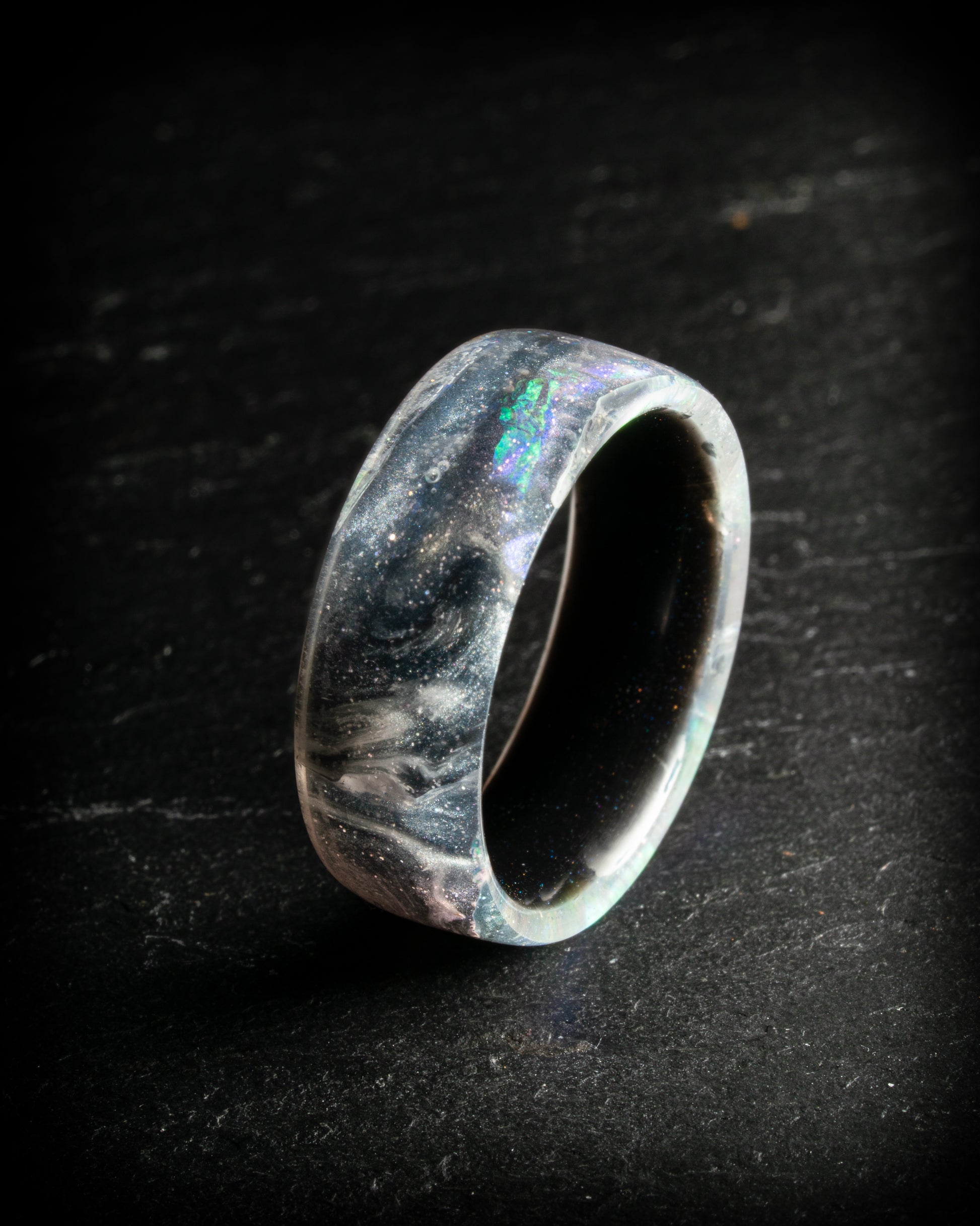 Custom made to order, this faux Opal ring has a marble pattern with an iridescence that catches beautifully in the light.