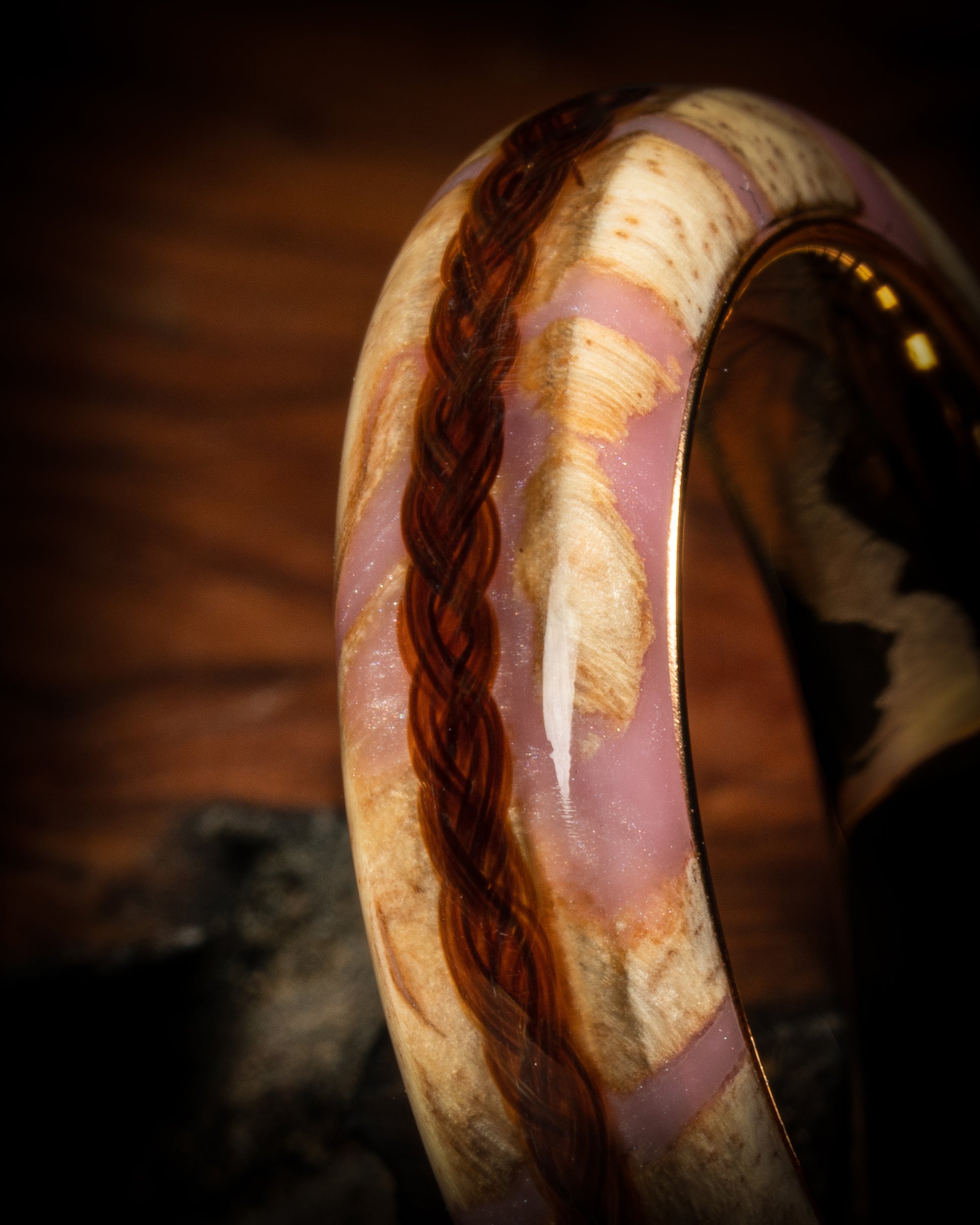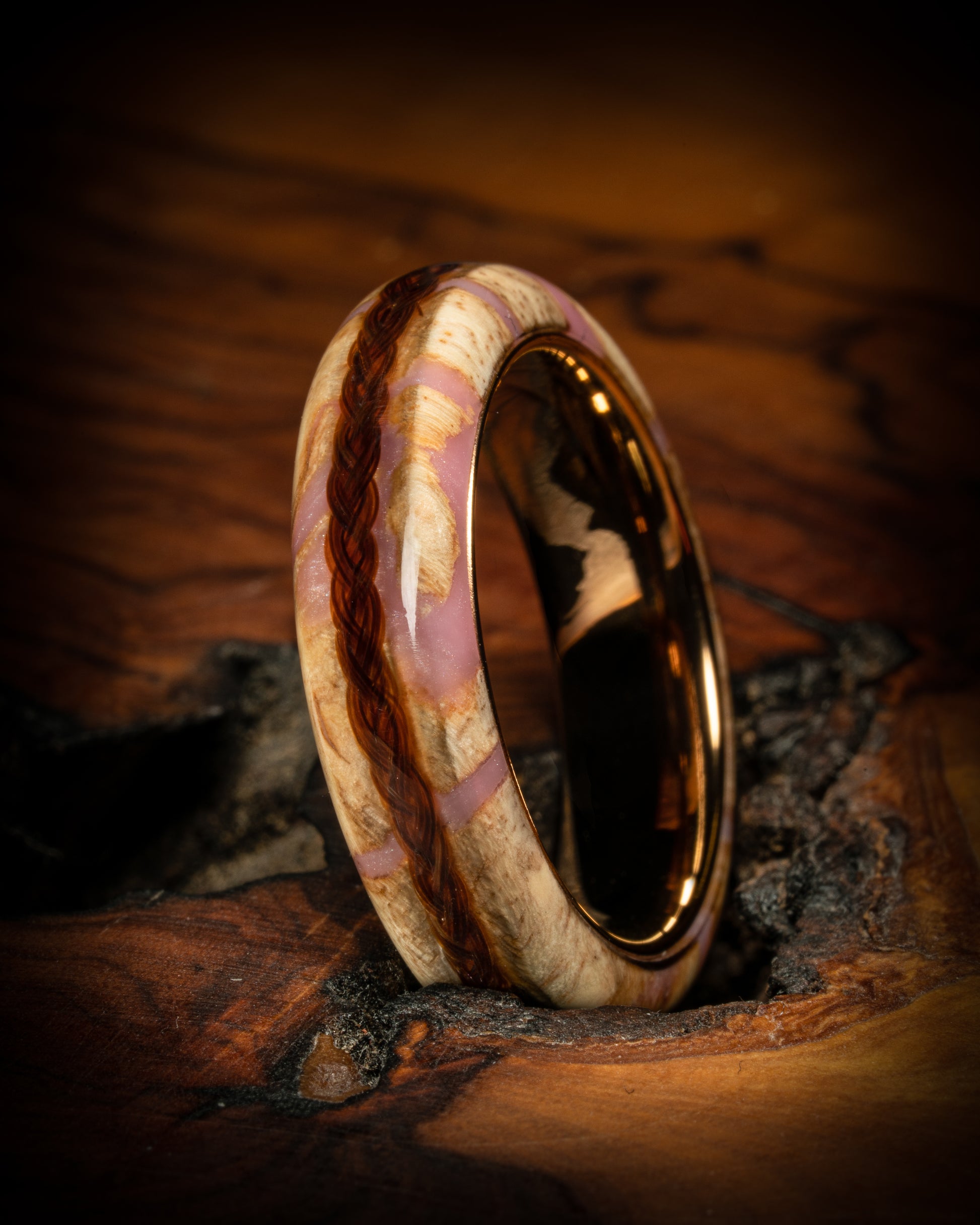 Main image ring is made from Myrtle wood mixed with light-pink resin with a Rose-Gold Tungsten Carbide ring liner.